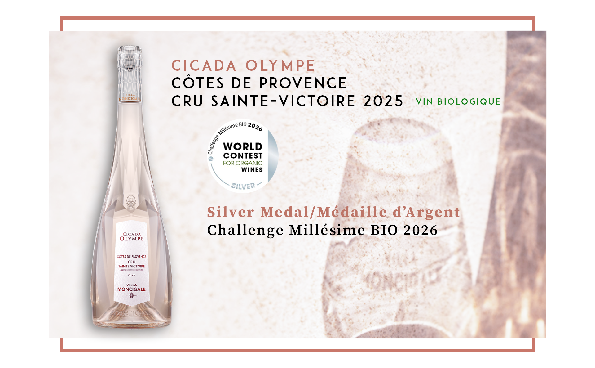 Notre rosé Cicada Olympe Côtes de Provence bio 2023 a fait sensation en rempartant quatre médailles d'argent : Au concours Mondial des Vins Biologiques 2024, aux Vinalies France 2024, au Mundus Vini 2024 et au concours des Vins de Provence 2024.
