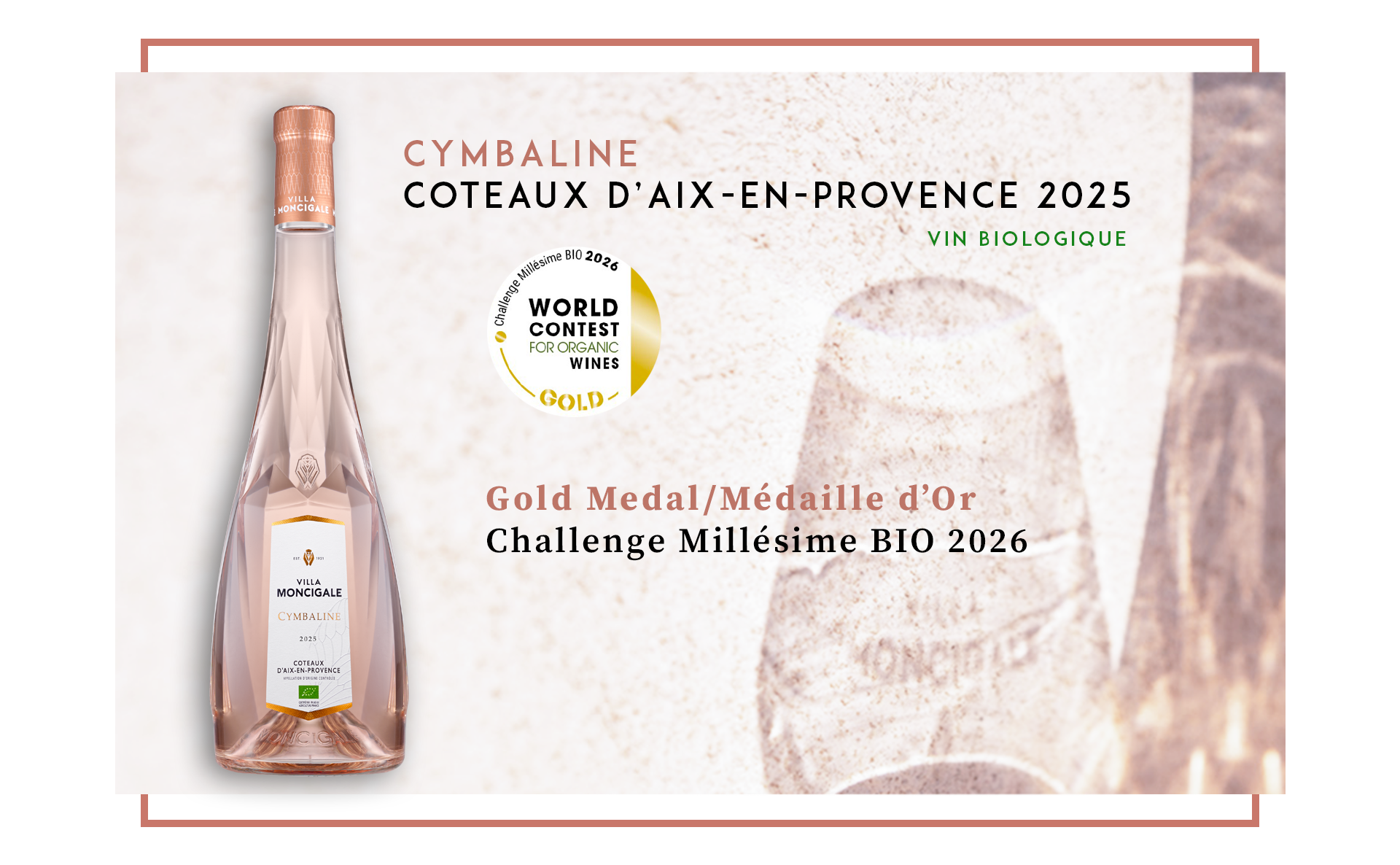 Villa Moncigale est l'unique maison de vin en Provence à avoir obtenu une médaille d'or et 95/100 sur l'appellation Coteaux d'Aix-en-Provence, au prestigieux concours International Wine & Spirit Competition en 2024.